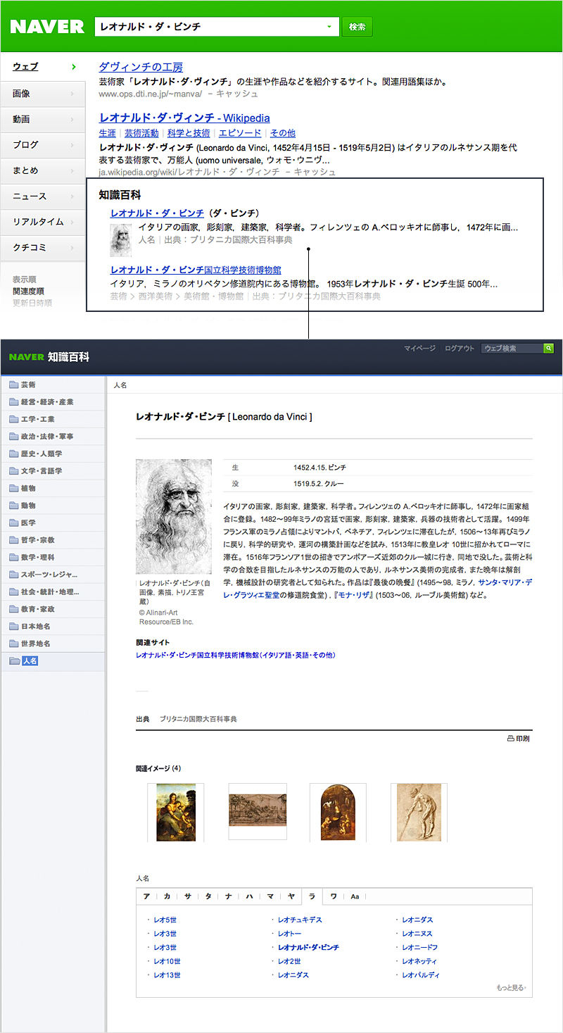 「NAVER知識百科」は、1768年から発行され続けている世界的にも有名な百科事典「ブリタニカ国際大百科事典(小項目事典)」「ブリタニカ国際年鑑」※(ブリタニカ・ジャパン刊)のコンテンツに加えて、フランス国立博物館連合などを通じてライセンス取得した美術作品情報を統合した総計約16万件の項目を収録しています。なお、コンテンツは今後も随時アップデートや追加をして充実させていきます。
