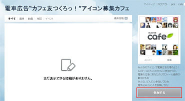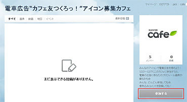 PCサイト: 1. NAVER cafeTOPページ(右上)から会員登録してください。(既に会員の方はログインをしてください) 2. 『電車広告"カフェ友つくろっ!"アイコン募集カフェ』にアクセスしてください。 3. 『電車広告"カフェ友つくろっ!"アイコン募集カフェ』ページの右側「参加する」ボタンをクリックすれば完了です。