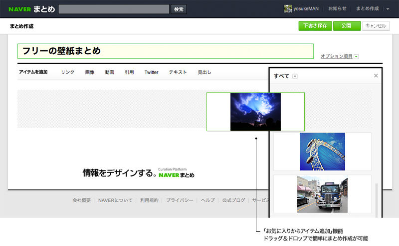 まとめ作成画面に、「お気に入りからアイテムを追加」という機能が登場しました。自分の「お気に入り」一覧を開き、ドラッグ&ドロップで手軽に作成中のまとめに追加することができます。