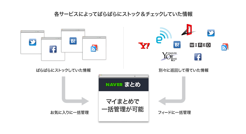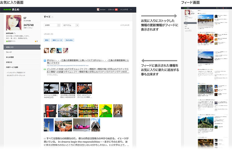 このように、NAVERまとめの情報はもちろん、普段自分が見ているソーシャルメディア上の情報もストック&チェックしていくことが可能になりました。そのため、今まで各サービスやページによってばらばらにストック&チェックしていた手間を省き、マイまとめ内の「お気に入り」一箇所にストックし、「フィード」さえ見れば新着情報が分かるようになります。