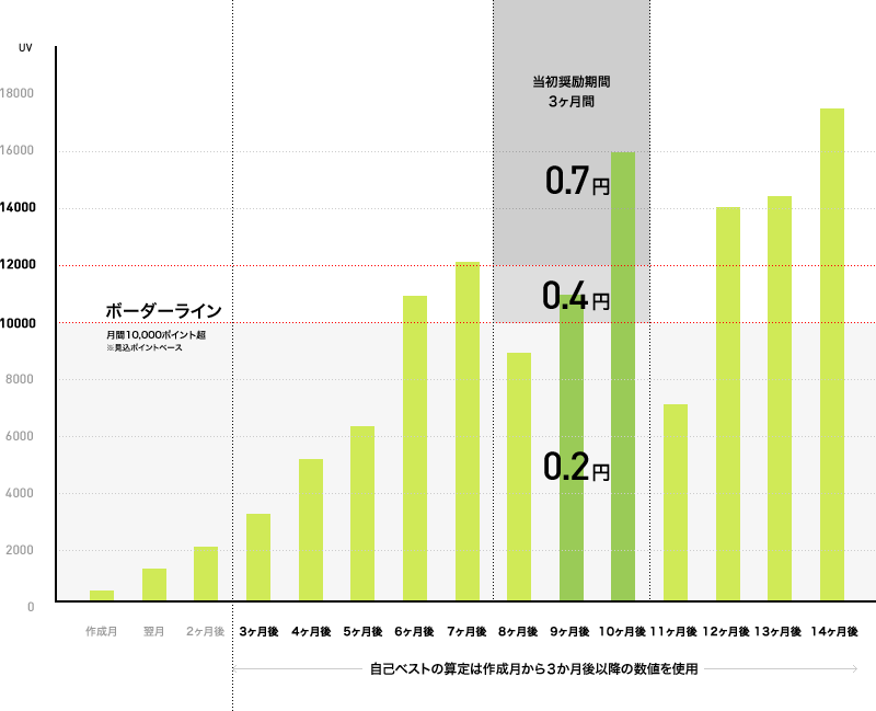 ・奨励期間中の月間成績に応じて、通常(0.2円)より高額のポイントレート( 0.4円、0.7円)を適用